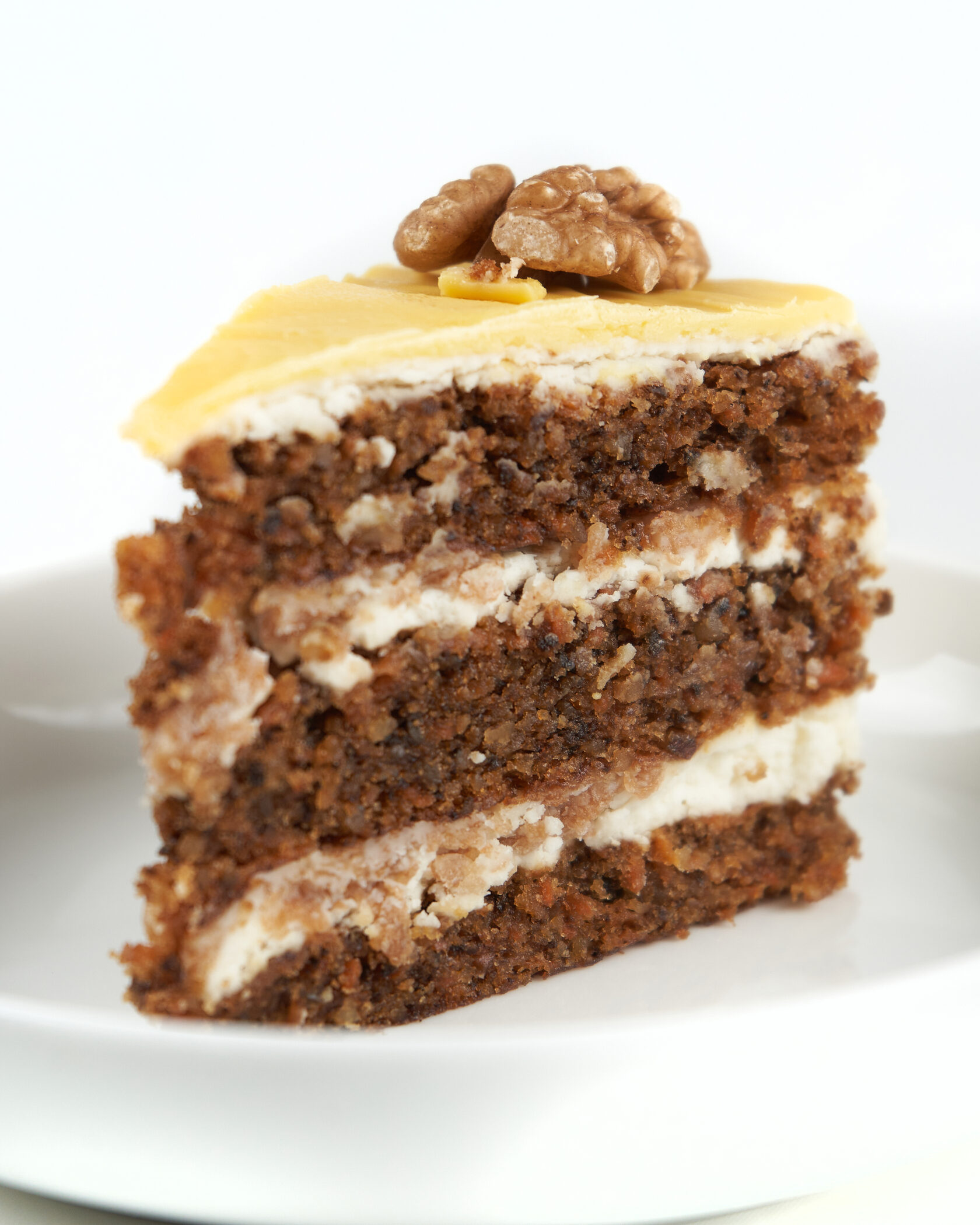 морковно-ореховый бисквит с апельсиновой цедрой и корицей, хрустящий слой с вафельной крошкой и белым шоколадом, крем на основе сливочного сыра.