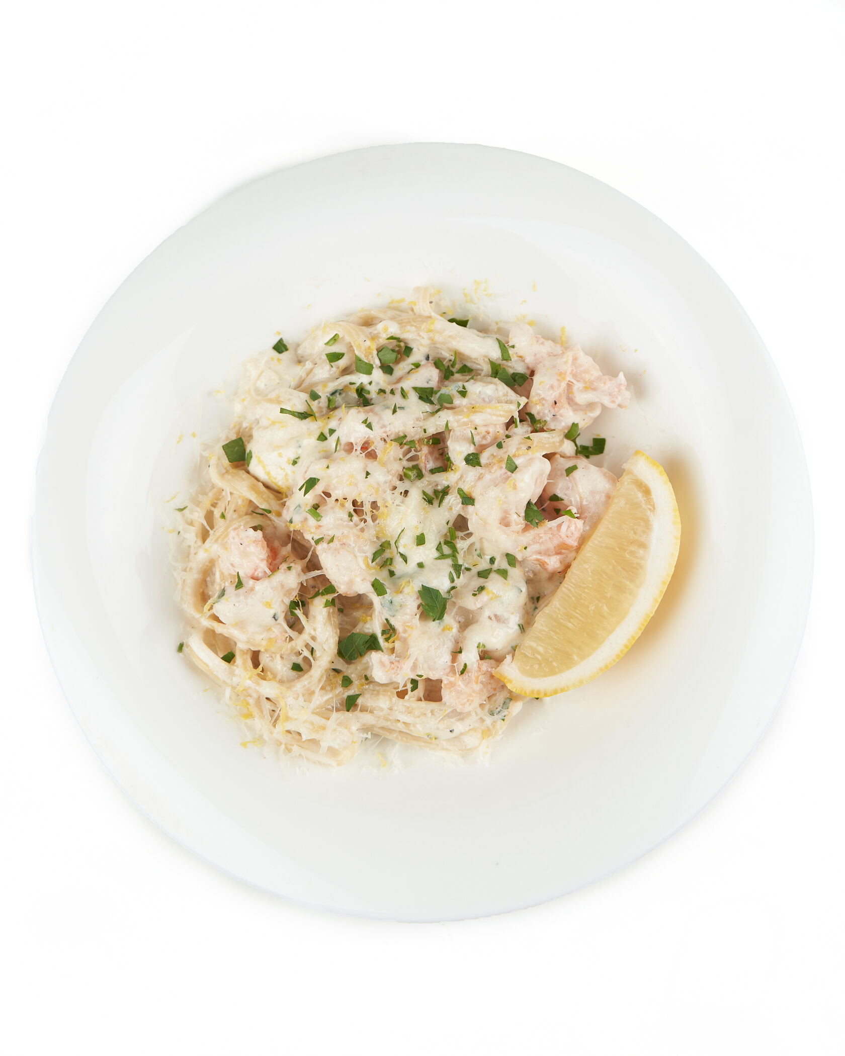 Креветки , чеснок , петрушка , сливки , паста Лингвини , пармезан , оливковое масло , лимон.